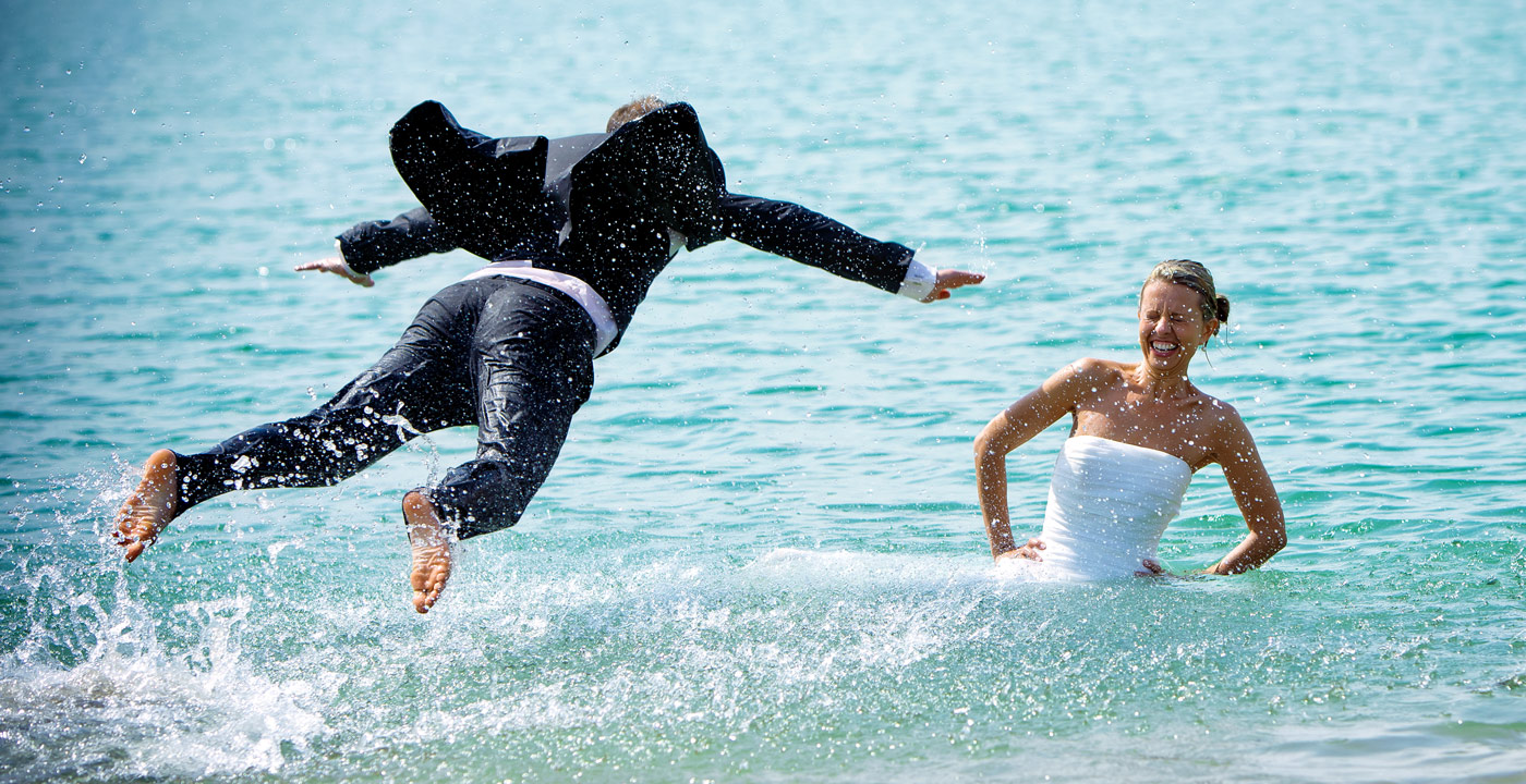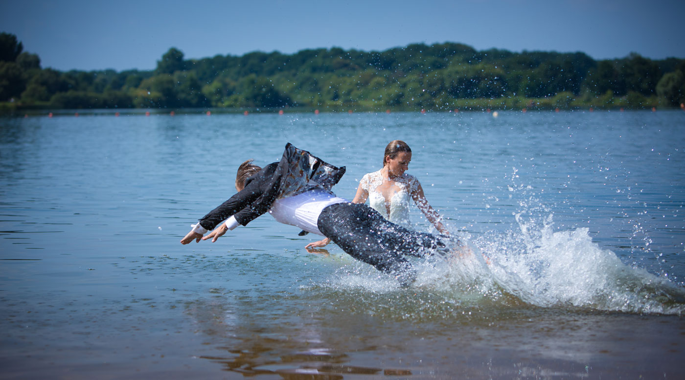 Früher seid Ihr für Eure Hochzeitsfotos in den Park gegangen. Aber wenn Ihr das heute macht, dann bleibt der Park nicht nur die hübsche Kulisse im Hintergrund: Diesmal springt Ihr vor dem Hochzeitsfotografen in den See, wühlt im Sandstrand oder klettert auf einen Baum. Vielleicht darf es auch ein kleiner „Farbrausch“ sein? So wie beim bekannten Holi Festival hantieren Braut und Bräutigam während des Fotoshootings mit vielen bunten Farben und färben sich kräftig ein. Was immer Ihr Euch wünscht – für uns als Hochzeitsfotograf ist fast alles möglich!